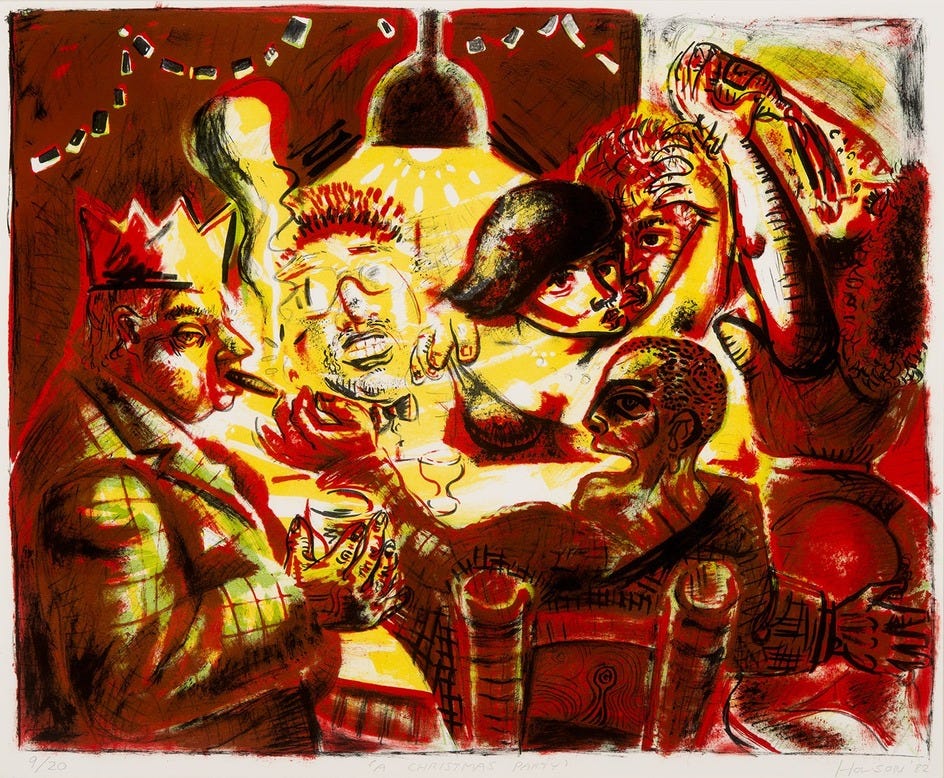 Peter Howson, Christmas Party, 1982 (via Aberdeen Archives, Gallery and Museum)